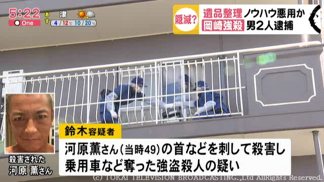 鈴木容疑者は会社の作業員・林淳一容疑者(40)と共謀。去年11月14日ごろ、岡崎市日名本町の集合住宅で、貸金業をしていた河原薫さん(当時49)の首などを刃物のようなもので刺し殺害したうえ、乗用車を奪ったなどの疑いで、4日朝、送検されました。