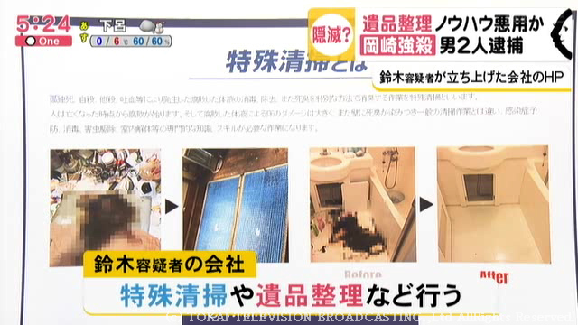 鈴木容疑者が別名義で立ち上げた会社のホームぺージを見ると、業務欄に「特殊清掃」や「遺品整理」の文字。孤独死の遺体が残された部屋やいわゆるゴミ屋敷などの片づけをする仕事です。