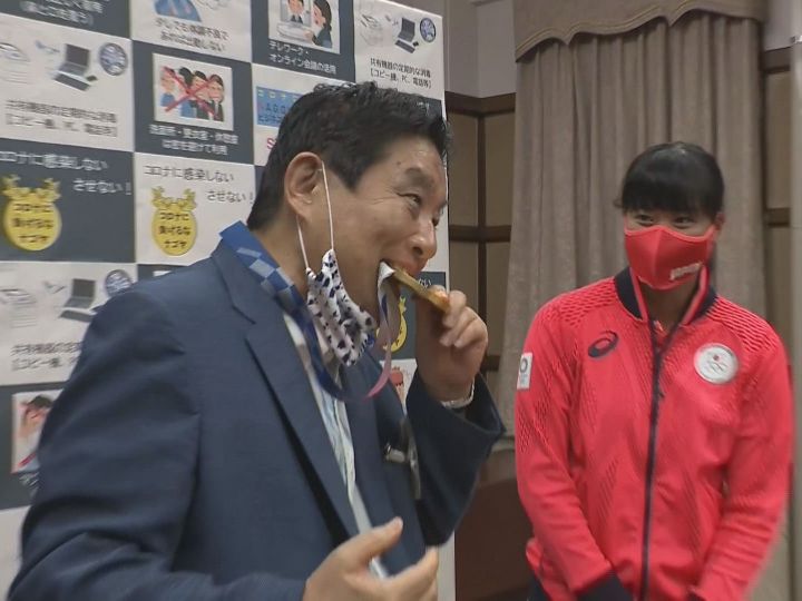 「持たしてちょ。せっかくなので、かけてちょうだい。重たいね、本当に。これ、重たいですよ。こうやって…な?」(この後メダルを噛む)