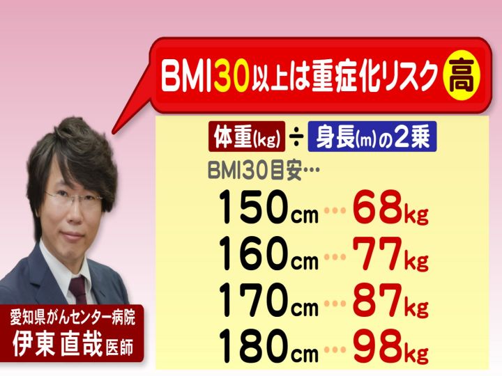 世界の研究の中で、「BMIの数値が30以上」というのが、重症化リスクが高くなる線引きとなっているということです。BMIは「体重(kg)÷身長(m)の2乗」で導かれる数値で、数字が大きいほど肥満となります。