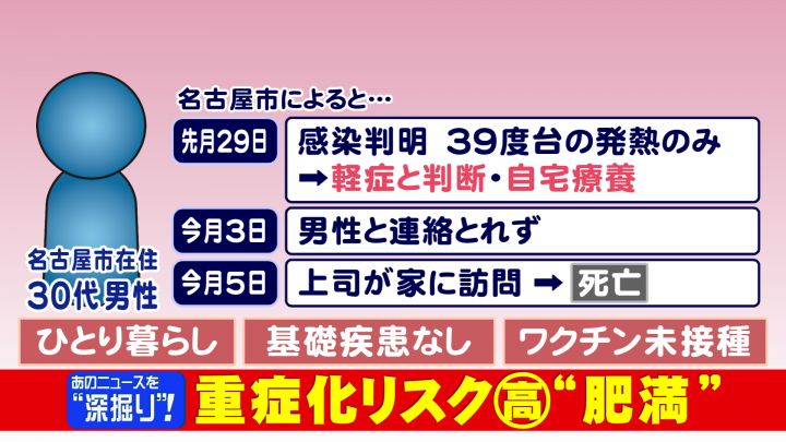 名古屋市は9月6日、新型コロナに感染し、自宅で療養していた30代の男性が死亡したことを発表しました。男性は重症化リスクが高いといわれる「肥満」だったということです。専門家に肥満のリスクについて伺いました。