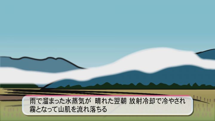 三重県御浜町で寒い朝に現れる『風伝(ふうでん)おろし』は、雨で盆地にたまった水蒸気が、晴れた翌日の朝に放射冷却によって冷やされ霧となり、山肌を流れ落ちる幻想的な自然現象です。