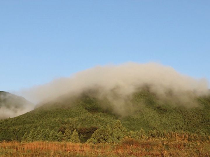 霧の量こそ少なめですが、それでも山肌に沿ってゆっくりと流れ落ちているのがわかります。興奮冷めやらぬ中歩いていると、カメラで撮影する男性の姿が…。男性は、今日はチャンスとばかりにやって来たといいます。
